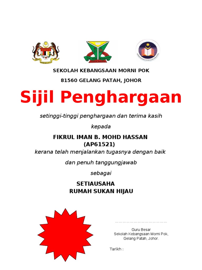 Contoh sijil prasekolah. Guru Besar SJK C Bemban. Lompat ke Halaman. SIJIL TAMAT PERSEKOLAHAN SRAI NEGERI SELANGOR.